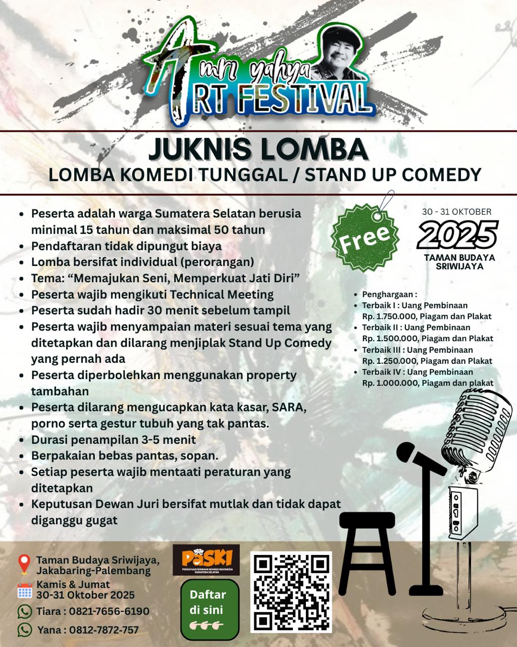 Taman Budaya Sriwijaya kembali bergeliat dengan helatan Amri Yahya Art Festival 2025, sebuah perayaan seni yang membuka ruang bagi anak-anak muda Sumatera Selatan untuk mengekspresikan jati diri melalui beragam lomba seni — dari Kaligrafi Kontemporer, Stand Up Comedy, hingga Tari Kreasi.