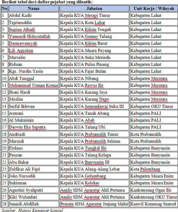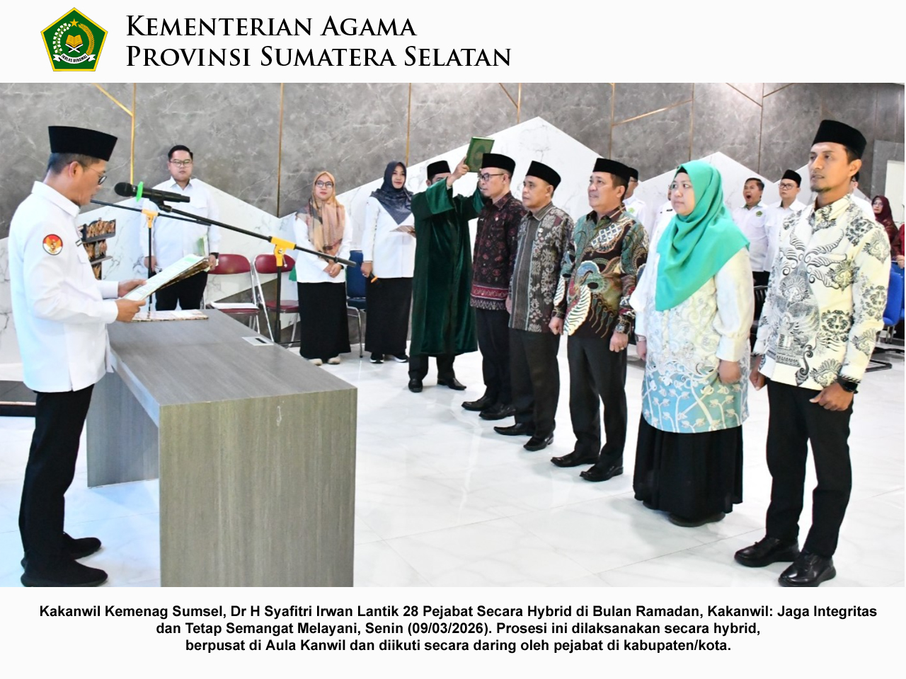 Di ruang itulah, Kepala Kantor Wilayah Kemenag Sumsel, Dr. H. Syafitri Irwan, melantik 25 Kepala Kantor Urusan Agama (KUA) dan tiga pejabat Jabatan Fungsional Tertentu (JFT).