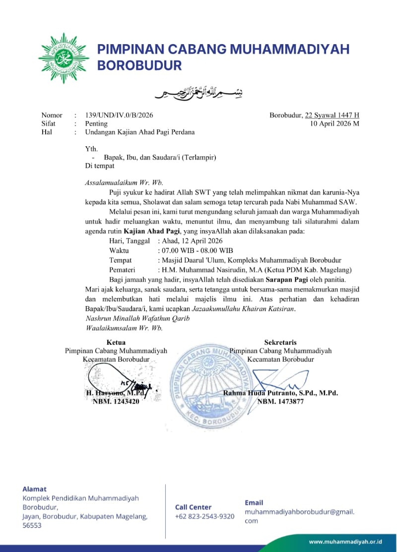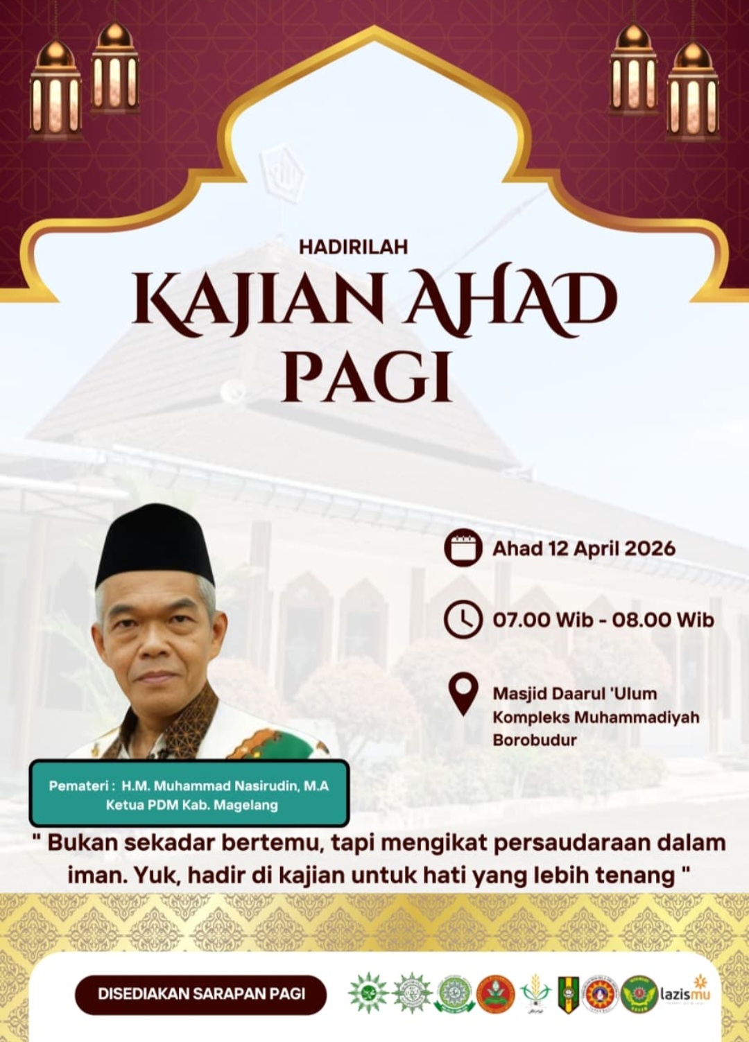 BOROBUDUR | KabarSriwijaya.NET — Pimpinan Cabang Muhammadiyah (PCM) Borobudur akan menggelar Pengajian Ahad Pagi Perdana pada Minggu (12/4/2026) di Masjid Daarul Ulum, Kompleks Muhammadiyah Borobudur. Menariknya, kegiatan ini tidak hanya menghadirkan kajian keislaman, tetapi juga menyediakan sarapan pagi bagi seluruh jemaah yang hadir.