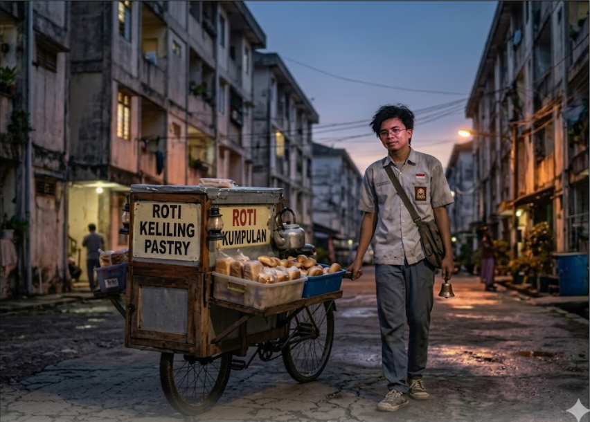 Ia harus berteriak lantang, seperti para aktor di panggung teater : Roti…! roti..! dengan harapan, gemanya bisa menembus telinga para warga di lantai III Rumah Susun –dan membeli dagangannya.