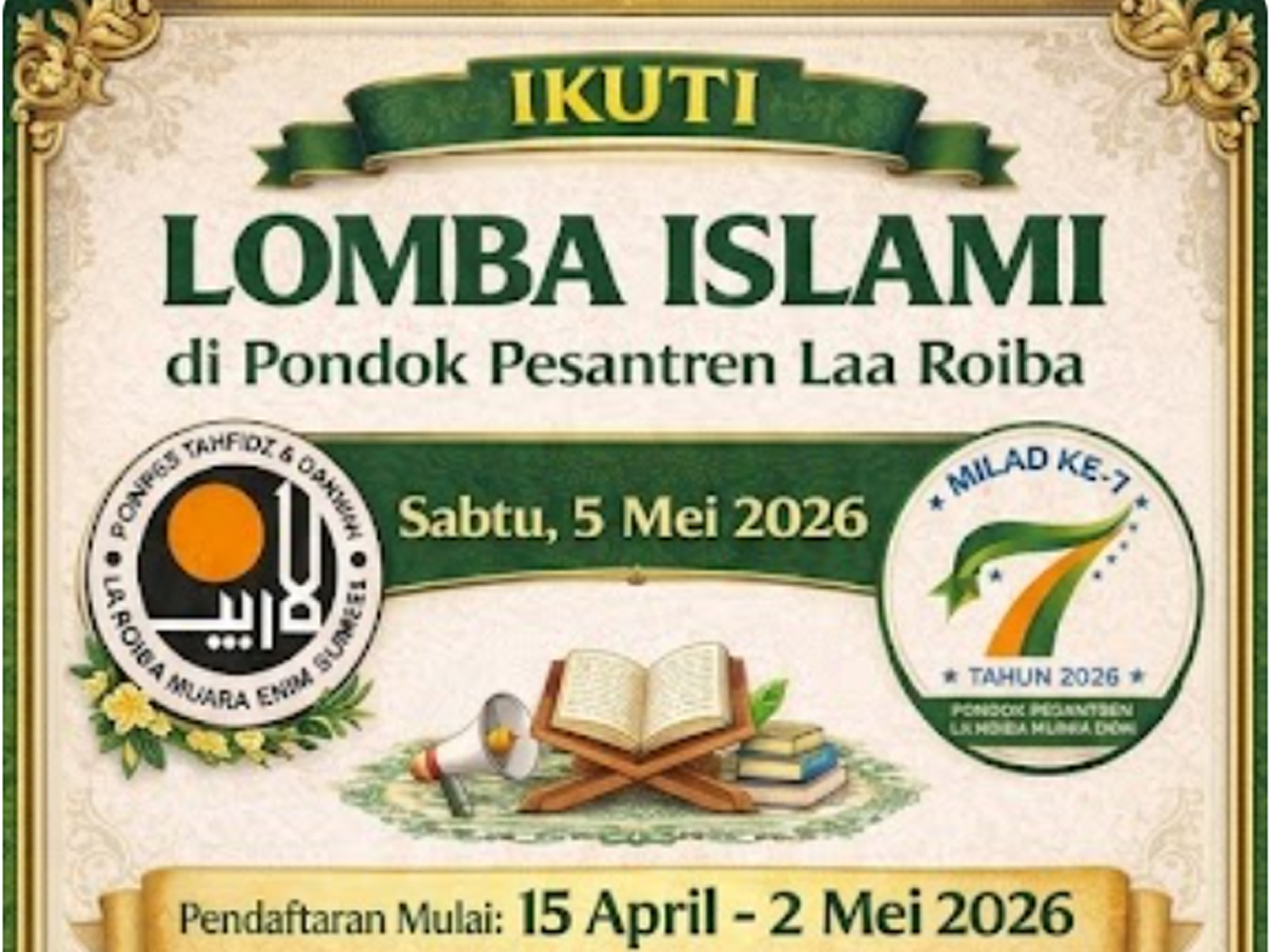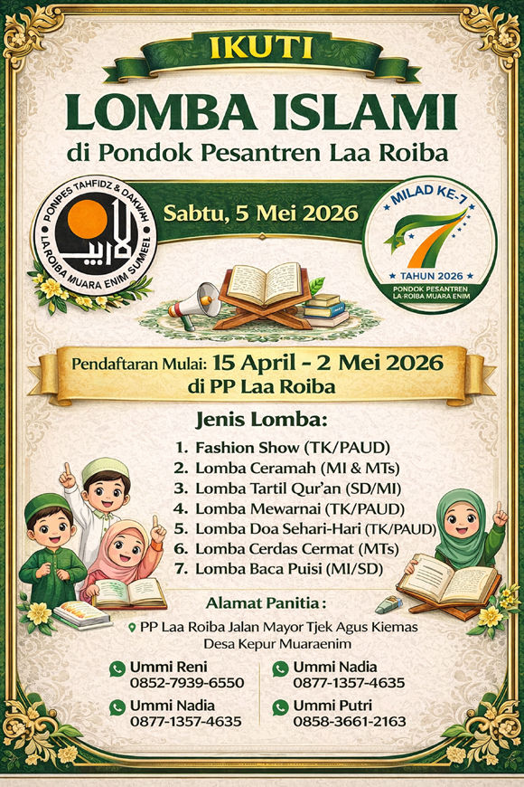 Lebih lanjut, alumnus Fakultas Tarbiyah IAIN Raden Fatah Palembang ini menjelaskan, acara pembukaan Lomba Islami dijadwalkan berlangsung pada Sabtu, 5 Mei 2026, sementara puncak kegiatan Milad ke-7 akan digelar pada 7 Mei 2026 di halaman utama Pondok Pesantren Laa Roiba, Muara Enim.