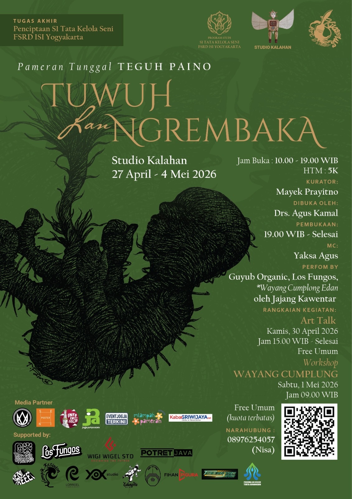 Pameran berlangsung hingga 4 Mei 2026, setiap hari pukul 10.00–19.00 WIB, dengan tiket masuk Rp5.000. Sejumlah agenda pendukung turut digelar, antara lain diskusi seni (art talk) pada 30 April 2026 serta lokakarya Wayang Cumplung pada 1 Mei 2026.